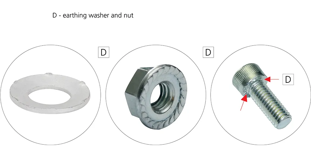 D - by earthing washers and serrations on bolts / nuts