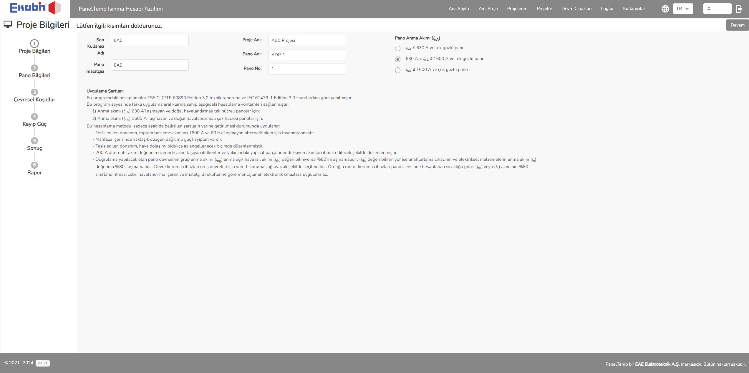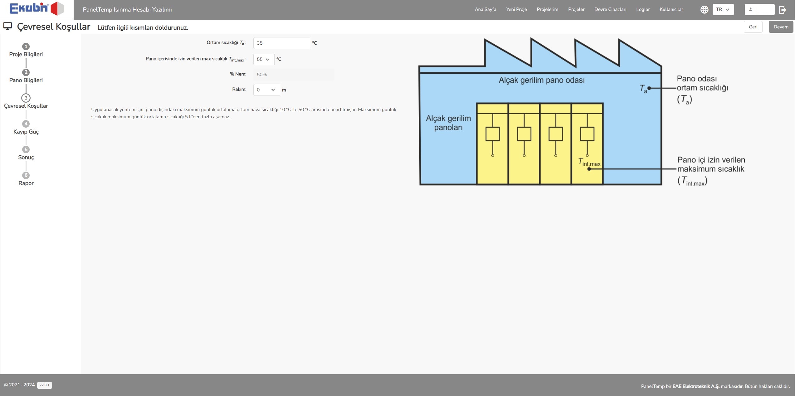 • Farklı Ortam Koşullarında Seçim ve Hesaplama İmkânı : Yazılım, panonun bulunduğu ortam sıcaklığı ve rakım değeri değiştirilerek hesaplama yapma imkânı sağlar.